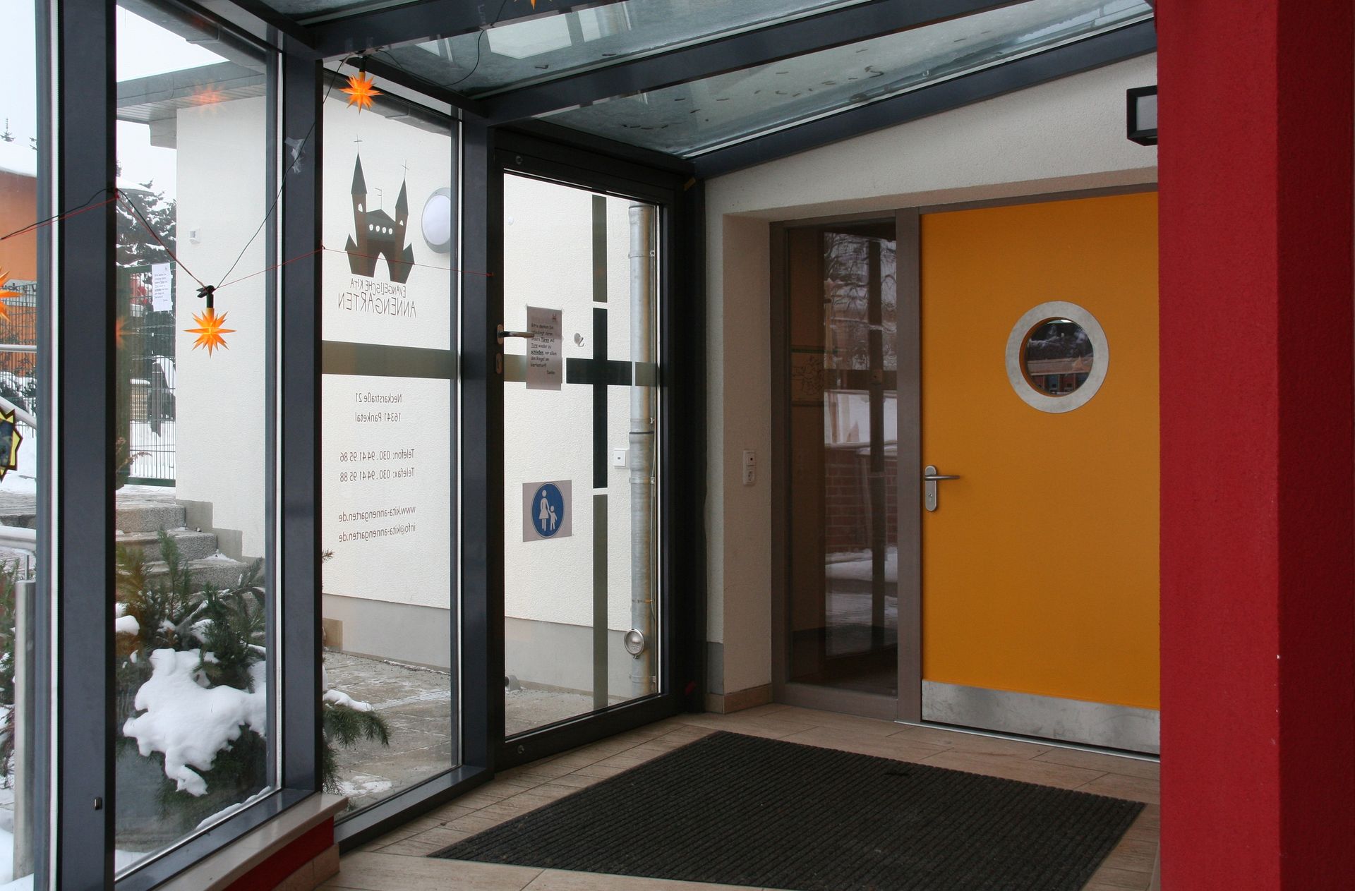 Die Kita für 70 Kinder entstand im nördlichen Teil des Pfarrgartens in unmittelbarer Nähe zu Kirche, Pfarrhaus und Gemeindezentrum. Das Gebäude erinnert an eine Schnecke, der Grundriss entwickelt sich um den zentral gelegenen Bewegungsraum. Die Schnecke bietet die Geborgenheit des festen Hauses, kann aber auch die Fühler ausstrecken und die Welt entdecken.